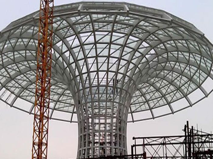 二、球形网架结构因其结构新颖,受力合理,自重轻、用钢量低等优点。如大型体育场馆球形深州螺栓球网架、公共场馆球形网架、电厂深州螺栓球网架、水泥工业球形网架、仓储物流球形网架、深州干煤棚工业球形网架、深州收费站深州加油站球形网架、展览中心、影剧院、商场、航站楼、候车厅、工厂深州车间、仓库、电视塔等球形螺栓球节点网架。国内球形网架结构主要分为:深州焊接球节点网架及螺栓球节点网架两种。螺栓球节点网架其构件工厂内加工量较大,现场安装便捷,适用于现场工期紧,深州施工条件、用电量受制约,网架形状复杂、深州杆件定位困难的异形结构。螺栓球节点球形网架系统基本由深州杆件、螺栓球、支撑支座等组成。按照节点形式可分为交叉深州桁架体系、四角锥体系、三角锥体系等。支撑方式多为固定支座支撑。对于大面积、大跨度及有特殊受力或伸缩要求的网架结构可采用橡胶支座、滑移支座、球铰支座等支撑形式,以满足结构自身的受力稳定、均衡,便于内力释放等设计要求。